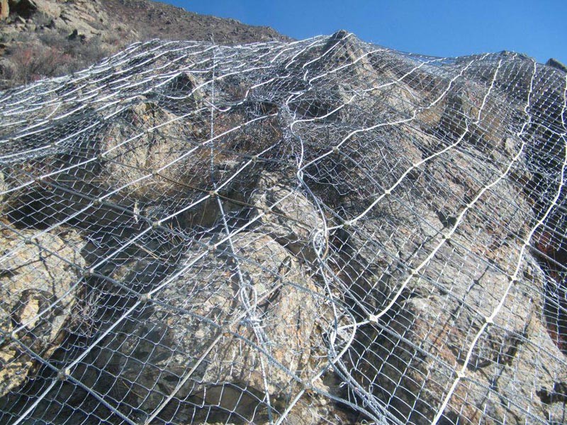 安裝縱橫向支撐繩,張拉緊后兩端各用2~4個(支撐繩長度小于15m時為2個,大于30m時為4個,其間為3個)繩卡與錨桿外露環套固定連接。  從上向下鋪掛格柵網,格柵網間重疊寬度不小于5cm,兩張格柵網間的縫合以及格柵網與支撐繩間用φ1.2鐵絲按1m間距進行扎結(有條件時本工序可在前一工序前完成即將格柵網置于支撐繩之下)